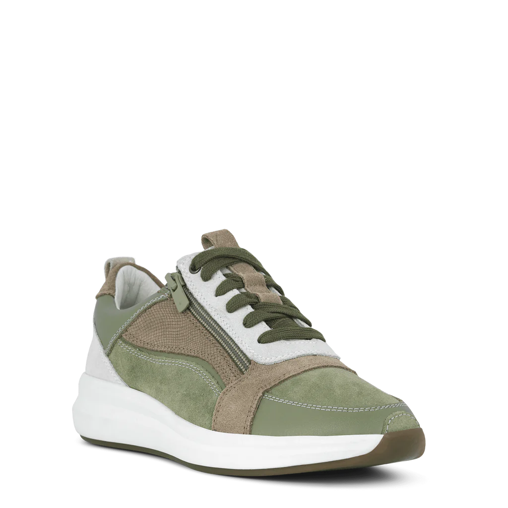 En fin kombination af farver og forskellige materialer giver denne Ivy-sneaker sit helt eget udtryk. Ruskind, læder og printet læder pryder skoene, der også er forsynet med lynlås, så de er let at få af og på. Den tilbyder en fantastisk komfort i kraft af en god pasform og 4,5 mm EnergySole med memory. Vores unikke EnergySole er fremstillet i et materiale, så den aldrig kan trædes flad, og derfor giver optimal stødabsorbering i hele skoens levetid. Ydersålen er fremstillet i phylon og forsynet med en gummiindsats på undersiden, så du står godt fast på alle underlag. Fóret i denne sneaker er helt unikt. DuPontT Sorona er et ekstra blødt og elastisk materiale, der består af polyester og bio-baserede fibre fra sukkerplanter. Fóret absorberer fugt fra fødderne, og tilbyder dermed en skøn komfort dagen igennem. Modellen er lavet på den rummelige Læst H.